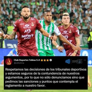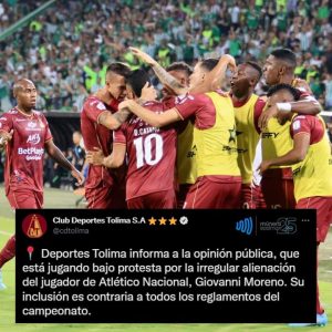 En medio del partido, Deportes Tolima informó que jugó bajo protesta por la inclusión de Giovanni Moreno en la nómina de Atlético Nacional, y aseguró que pedirá los tres puntos que perdió en el Atanasio 🤔