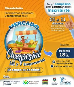 📌La administración Municipal en cabeza de José Francisco Lozano Sierra, tiene el gusto de Invitar a todos los girardoteños a incribirse para ser parte del Mercado Campesino que se realizará el 18 de Diciembre con el acompañamiento y aporte de ASOJUNTAS.