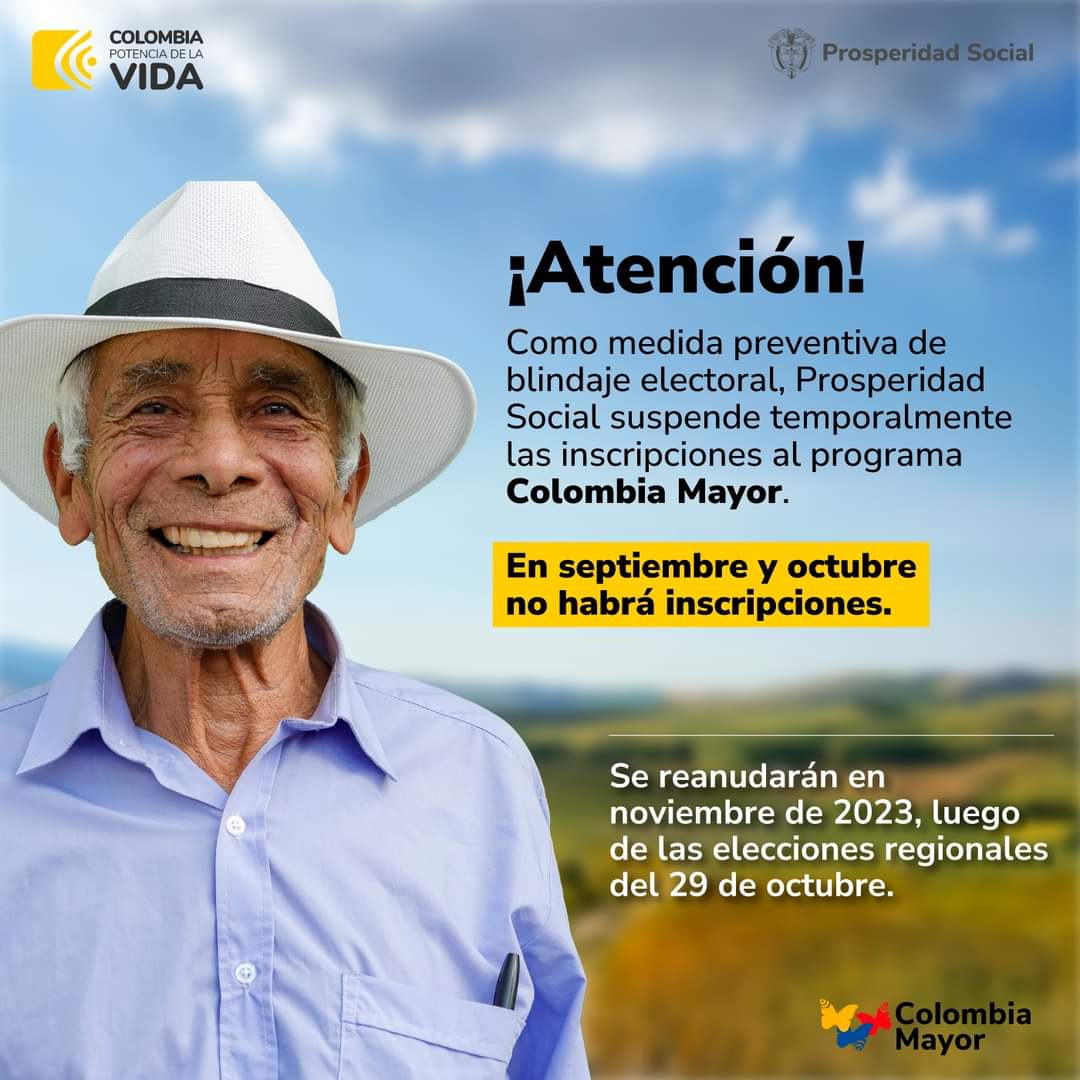 #Atención | Por septiembre y octubre se suspenden inscripciones al programa Colombia Mayor. Esta medida es temporal y no afecta la entrega de los recursos destinados a los beneficiarios actuales. Recuerden: los trámites ante los programas de Prosperidad Social no generan ningún costo ni requieren intermediarios.