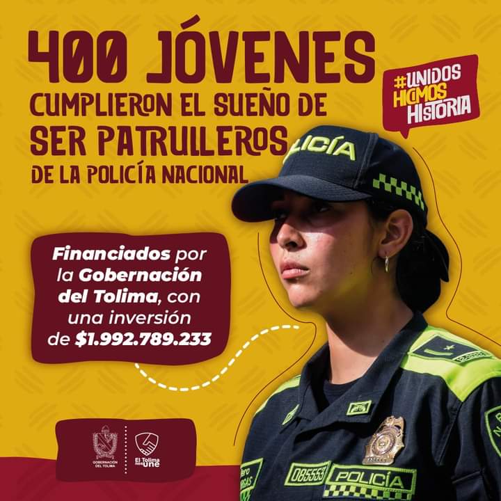Invertimos en el futuro de jóvenes de escasos recursos que hoy son patrulleros de la Policía Nacional, gracias al curso gratuito financiado por la Gobernación del Tolima, iniciativa ejemplar a nivel nacional. #UnidosHicimosHistoria 🤝