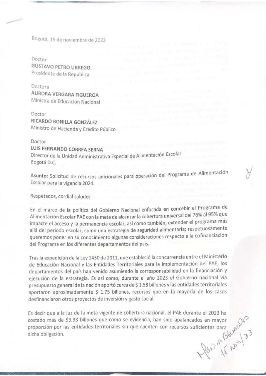 La solicitud está dirigida el presidente Gustavo Petro, al ministro de Hacienda Ricardo Bonilla, a la ministra de Educación Aurora Vergara, y al director de la Unidad Administrativa Especial de Alimentación Escolar Luis Fernando Correa