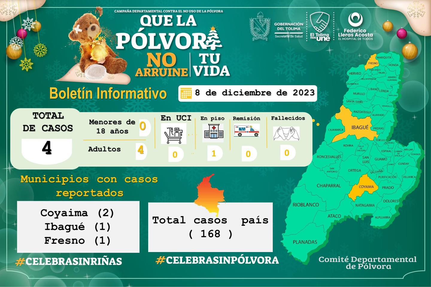 La noche de las velitas en el Tolima dejó un reporte de dos nuevos casos en hombres adultos. Ibagué (1) Fresno (1) Las autoridades departamentales hacen un llamado a la comunidad para que celebre sin pólvora y así proteger la vida y la salud de todos. Visitas: 4 Navegación de entradas CLARA LUZ ROLDAN GOBERNADORA DEL VALLEPROSPERIDAD SOCIAL