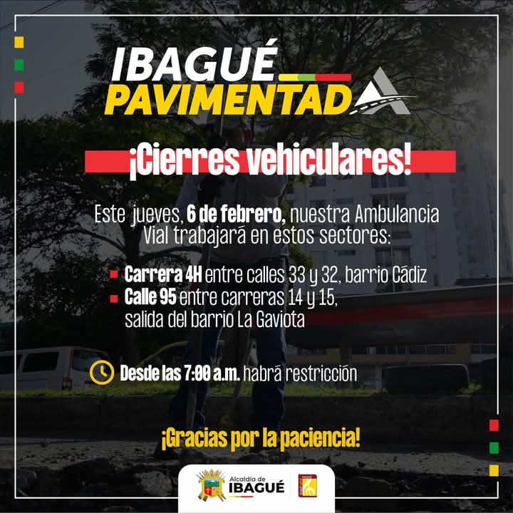 🚧 CIERRES VIALES 🚨 Seguimos trabajando por una Ibagué Pavimentada. Conoce los puntos en donde intervendrán nuestras cuadrillas. 🚑👷🏽♂️